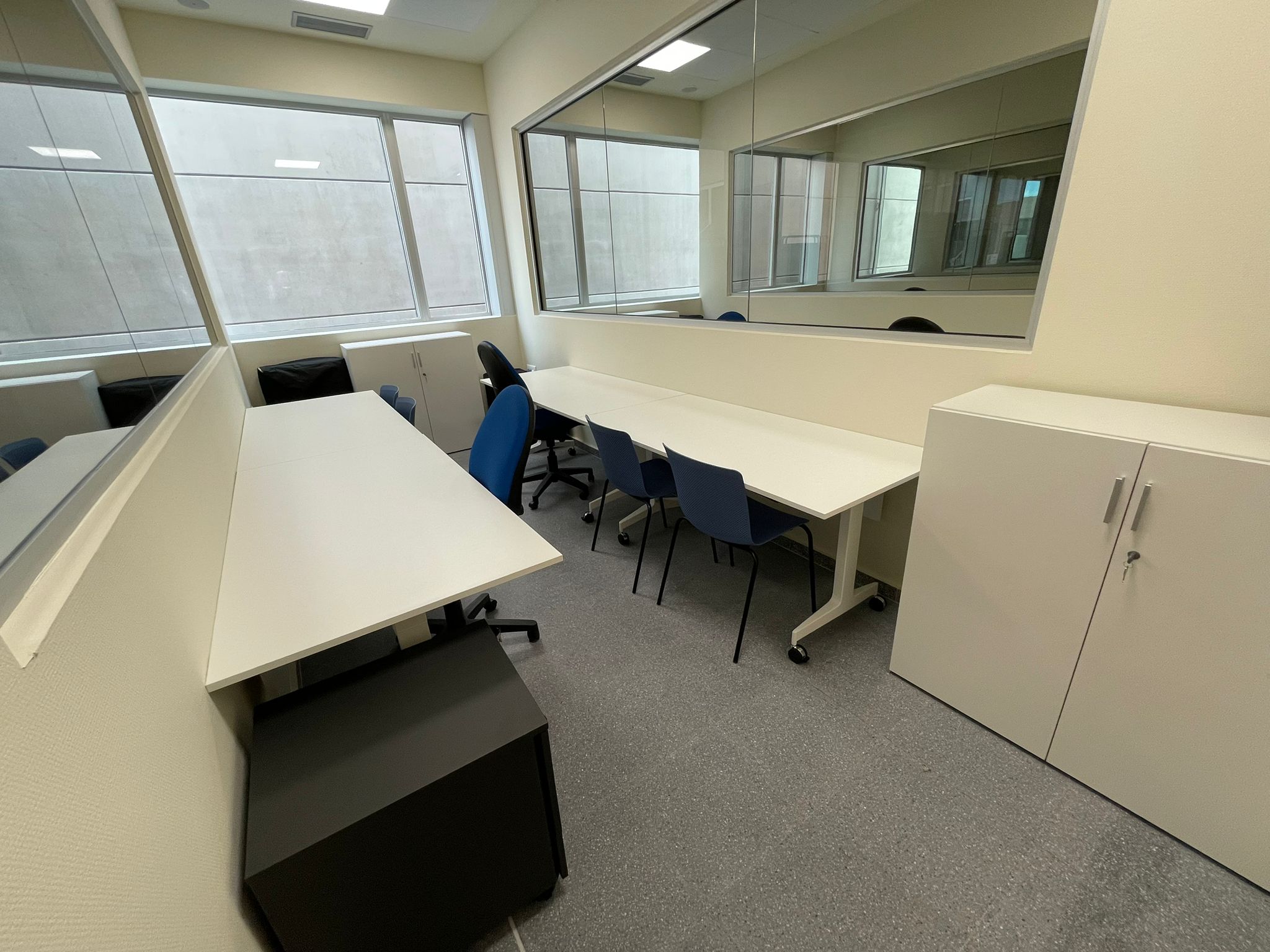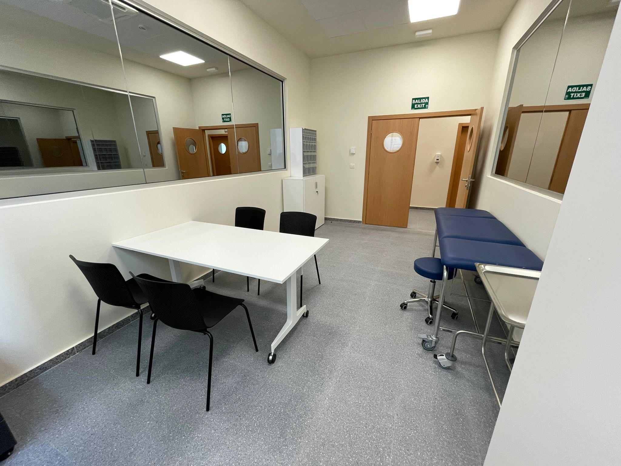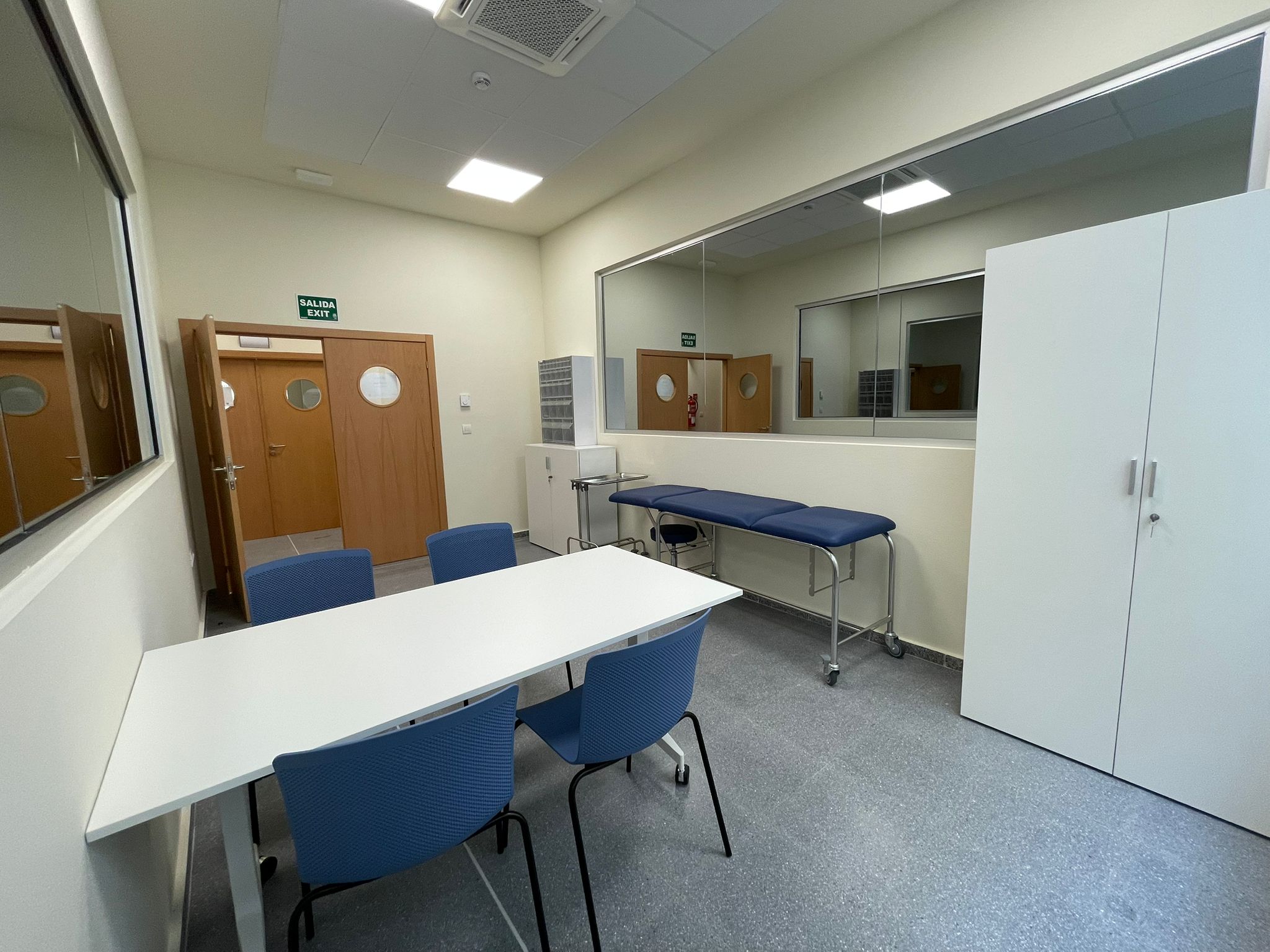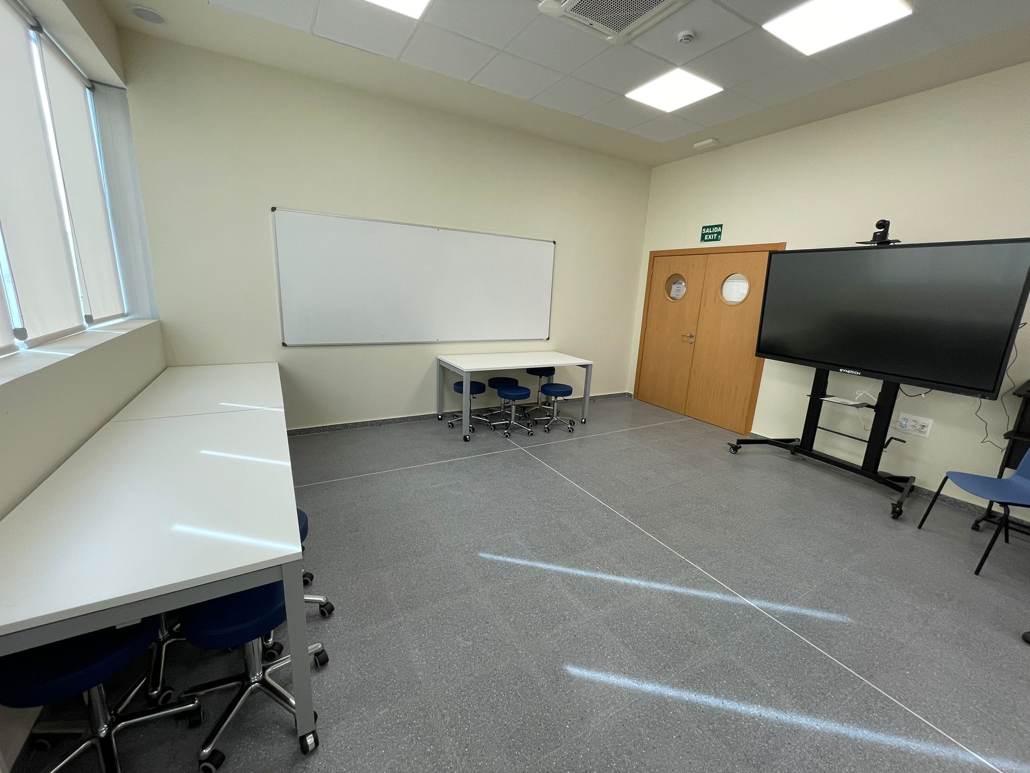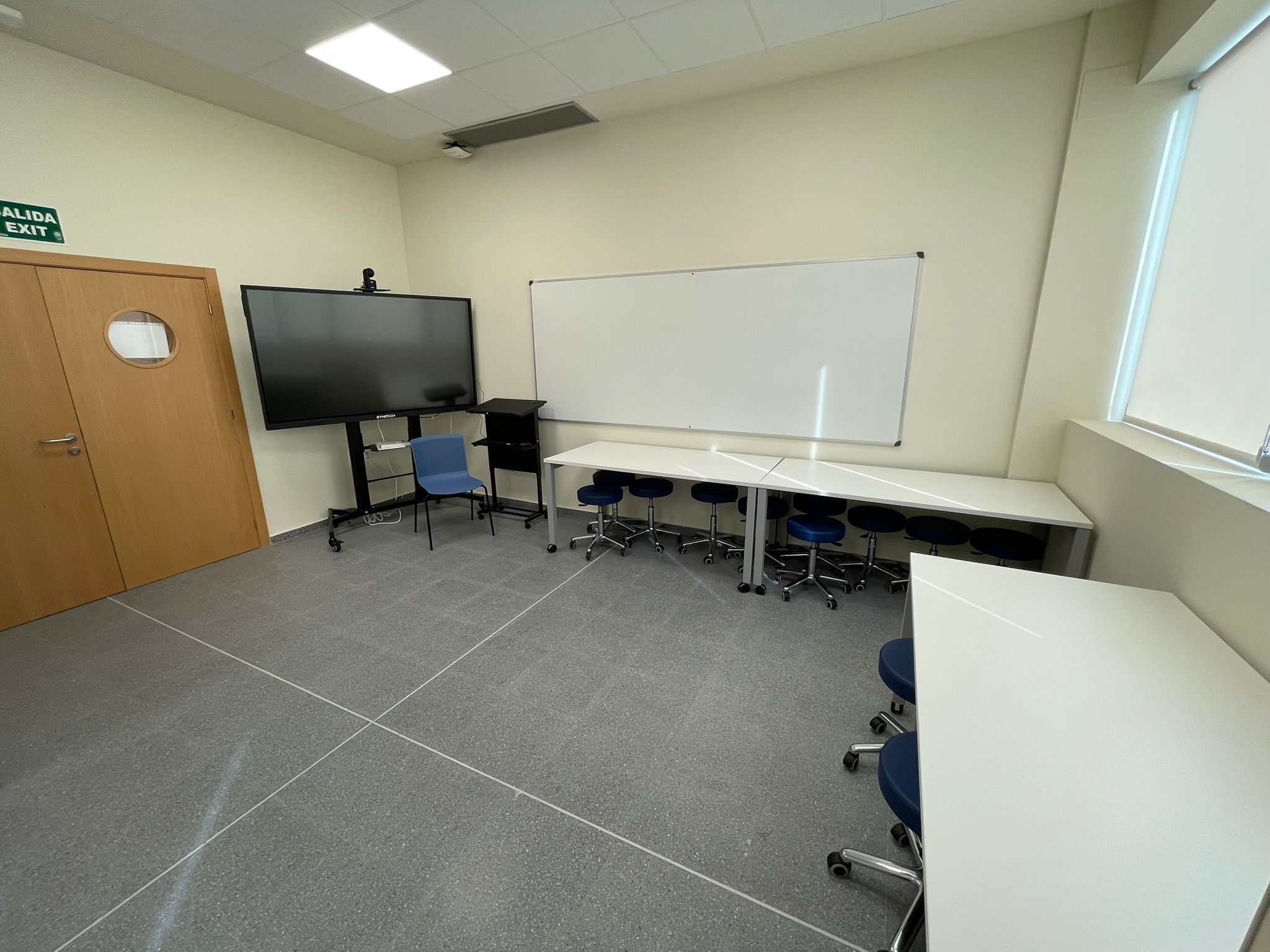 Esta sala de 37m² está dotada de una pantalla táctil capacitiva de 86” para visualizar los escenarios clínicos, un ordenador que gestiona el software de las cámaras y una mesa de reuniones para 14 personas. Asimismo, incorpora un sistema de captación y grabación audiovisual. Esta sala está gestionada por el personal del Centro Experimental Cyborg. Para solicitar reserva de espacio pulse aquí.
