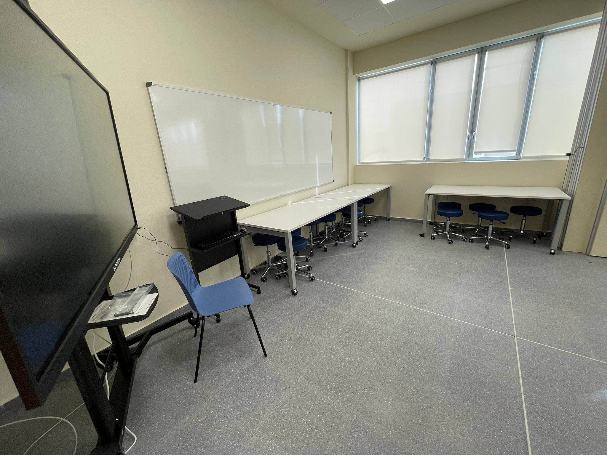 Laboratorio de 57m² (25px) preparado para la realización de prácticas que desarrollen habilidades quirúrgicas mediante simuladores de baja fidelidad o task trainers. Dispone de pantalla interactiva con pc para proyección audiovisual.